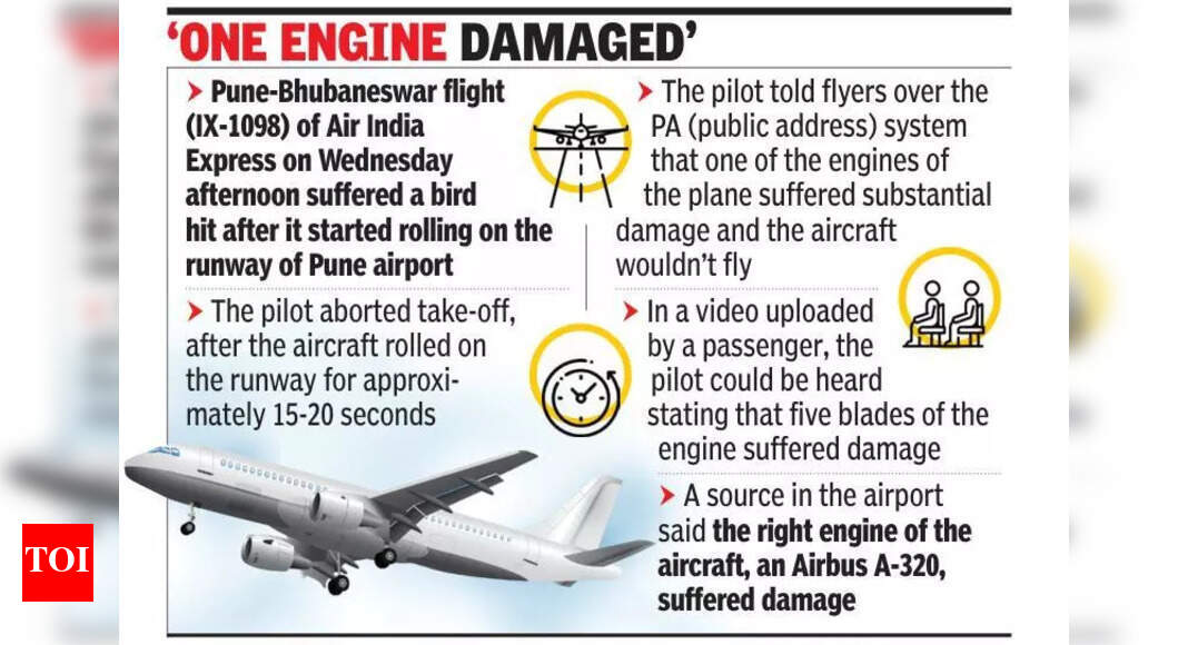 पुणे: बुधवारी दुपारी एअर इंडिया एक्सप्रेसच्या ‘पुणे-भुबनेश्वर फ्लाइट (आयएक्स -1098) च्या सुमारे १ Passengers० प्रवासींनी धावपट्टीवरुन फिरणे सुरू केल्यावर विमानाने टेक ऑफ केल्यामुळे जवळपास दाढी झाली.विमानाच्या 22 व्या क्रमांकावरील प्रवासी मोहम्मद नदीम यांनी टीओआयला सांगितले की, “वेग वाढल्यानंतर इंजिनमधून फ्लेम्स बाहेर येऊ लागल्या. त्यानंतरच पायलट ब्रेकवर आदळला आणि विमानाने जोरदार धडक दिली की काही प्रवाशांच्या सेलफोनने जवळजवळ एका महिलेच्या शस्त्रे पडल्या.”ते म्हणाले की, विमानाने जोरदार थांबण्यापूर्वी सुमारे 15-20 सेकंद धावपट्टीवर हे विमान धावपट्टीवर फिरले. पुणे विमानतळाची धावपट्टी लांबी 2,535 मीटर (8,316 फूट) आहे. एव्हिएशन तज्ञांनी टीओआयला सांगितले की टेक ऑफ करण्यापूर्वी एअरबस ए 320 सारख्या विमानाची सरासरी पीक वेग 250-300 किमी प्रति तास आहे.“विमानाचा वेग पायलटद्वारे नेहमीच ठरविला जातो. तीन प्रकारचे वेग आहे-व्ही 1 (निर्णय वेग), व्हीआर (रोटेशन स्पीड) आणि व्ही 2 (टेक-ऑफ सेफ्टी वेग). व्ही 1 ही आपत्कालीन परिस्थितीत एक आपत्कालीन परिस्थितीत पायलट सुरक्षितपणे घेता येईल. वी 1 च्या मर्यादेनंतर हवामानाचा वेग वाढला पाहिजे. फोर्स, “विमानचालन तज्ज्ञ धैर्यशिल वंडेकर म्हणाले.गेल्या महिन्यात, शहराच्या विमानतळावर उतरल्यानंतर एअर इंडियाच्या दिल्ली-पुणे विमानात एक पक्षी हिट सापडला. जूनमध्ये, भुवनेश्वर येथून एअर इंडियाच्या एक्स्प्रेसच्या विमानाने लँडिंगचा गर्भपात करावा लागला आणि पायलटने धावपट्टीवर कुत्राला शोधून काढले.बुधवारी दुपारी विमान थांबल्यानंतर सुमारे -10-१० मिनिटांनंतर एअर इंडियाच्या पुणे-भुबनेश्वर विमानात बुक केलेले नदीम यांनी सांगितले. “त्यानंतर पायलटने पीए (सार्वजनिक पत्ता) प्रणालीवरील घटनेबद्दल फ्लायर्सना सांगितले. ते म्हणाले की, एका इंजिनला मोठ्या प्रमाणात नुकसान झाले आहे आणि विमान उडणार नाही. काही काळानंतर विमान खाडीवर परत आले. आम्हाला खाली उतरून टर्मिनल इमारतीत नेण्यात आले,” तो म्हणाला.टीओआयने एअरलाइन्सच्या प्रवक्त्याशी फोनवर संपर्क साधला आणि घटनेबद्दल चौकशी करणारा व्हॉट्सअ‍ॅप संदेश त्याला पाठविला. पण दाबायला जाईपर्यंत उत्तराची प्रतीक्षा होती.विमानतळावरील एका स्त्रोताने सांगितले की, एअरबस ए -320, विमानाच्या योग्य इंजिनला नुकसान झाले आहे. नदीमने अपलोड केलेल्या व्हिडिओमध्ये, पायलटला असे ऐकले जाऊ शकते की इंजिनच्या पाच ब्लेडचे नुकसान झाले आहे. पायलटने असेही म्हटले आहे की धावपट्टीवर एक मोठा पक्षी शोधला गेला आणि तो विमानाच्या इंजिनवर आदळला.नदीम म्हणाले, “एअरलाइन्सने सांगितले की, फ्लायर्ससाठी पर्यायी विमानांची व्यवस्था केली जात आहे. मला दिल्लीला जोडणारी उ